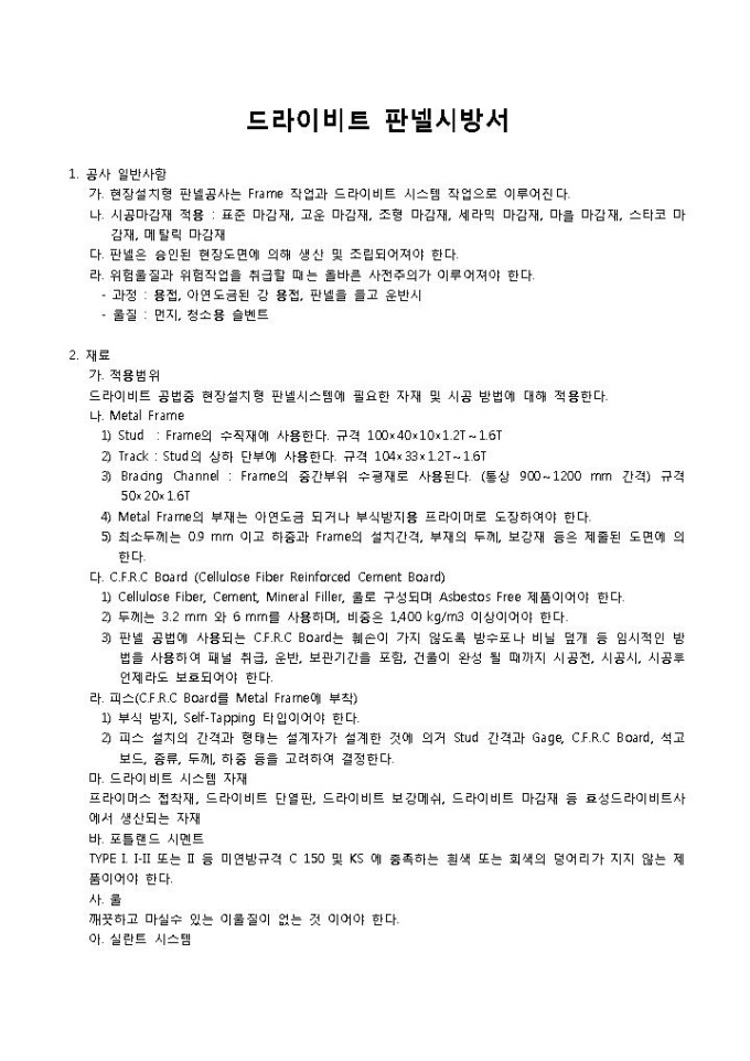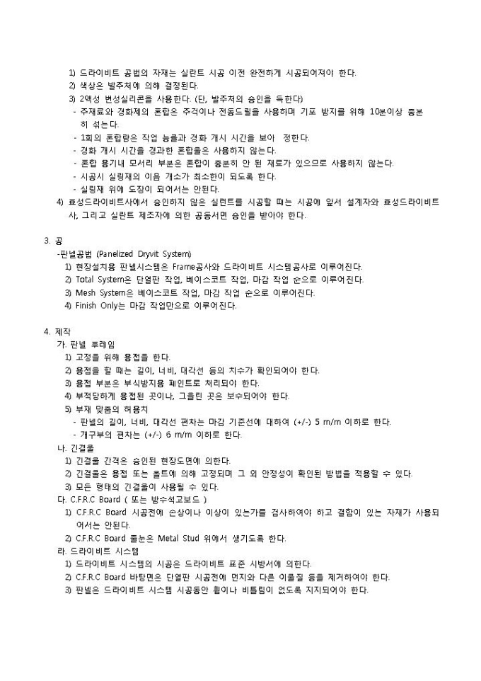 9,000원/월드라이비트 판넬시방서입니다. 공사 일반사항, 재료, 공, 제작, 기타사항으로 구성되어 있습니다. 공사현장에 드라이비트에 대한 판넬 시방서로 작성하여 사용할 수 있습니다.