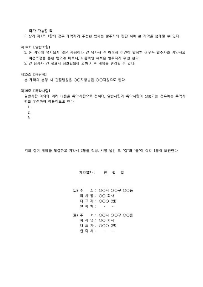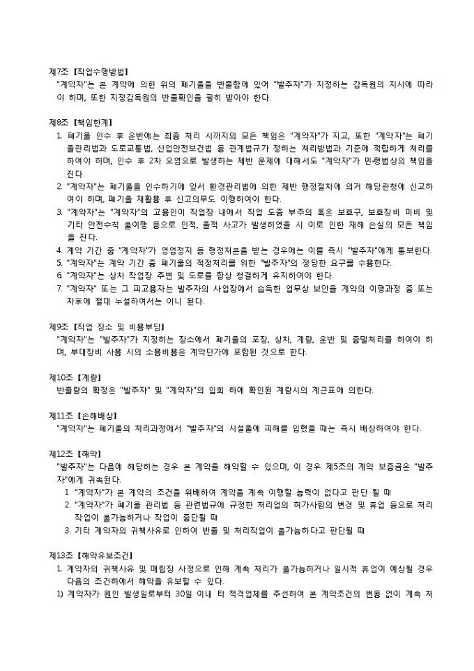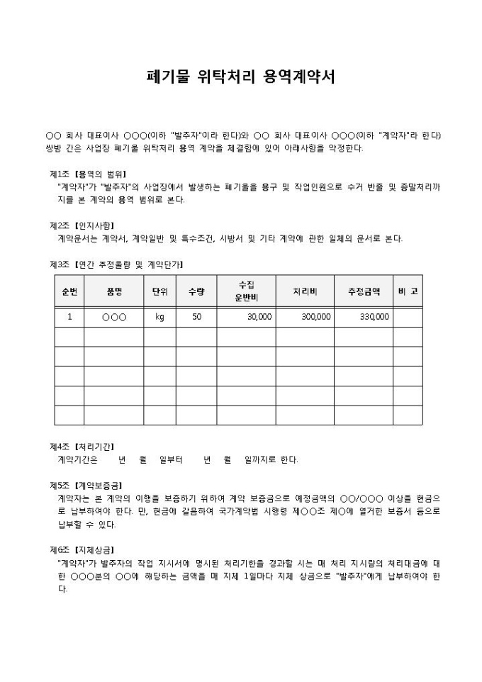 9,000원/월사업장 폐기물 위탁처리 용역 계약을 체결함에 있어 여러 필요한 사항을 약정할 때 사용되는 폐기물 위탁처리 용역계약서 양식입니다. 조항, 연간 추정물량 및 계약단가, 계약일자, 서로간의 인적사항의 항목으로 구성되어 있습니다.