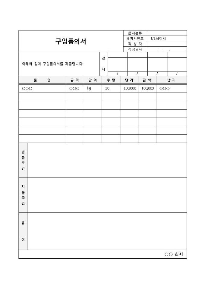 9,000원/월물품의 구입에 앞서서 해당 내용을 상부에 보고하고 결재를 받기위해 사용되는 구입품의서 양식입니다. 품명, 규격, 단위, 수량, 단가, 금액, 납품 및 지불의 조건 등의 항목으로 구성되어 있습니다.