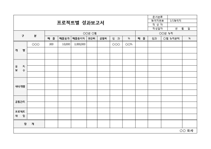 9,000원/월프로젝트별로 시행 결과에 따른 성과를 보고할 때 사용되는 프로젝트별 성과보고서 양식입니다. 구분, 매출원가, 총 이익, 판관비, 공통비, 성과, 누적손익 등의 항목으로 구성되어 있습니다.