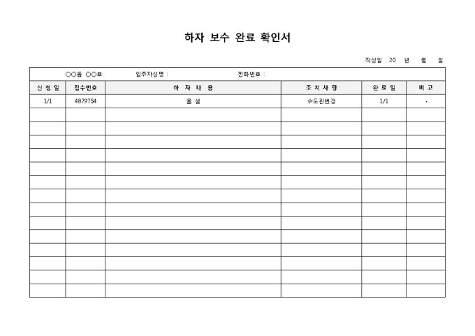 9,000원/월하자보수확인서(완료)입니다. 신청일, 접수번호, 하자내용, 조치사항, 완료일 등의 항목으로 구성되어 있습니다. 아파트에서 여러항목의 하자보수 완료 상황에 대해 파악할 때 사용할 수 있습니다.