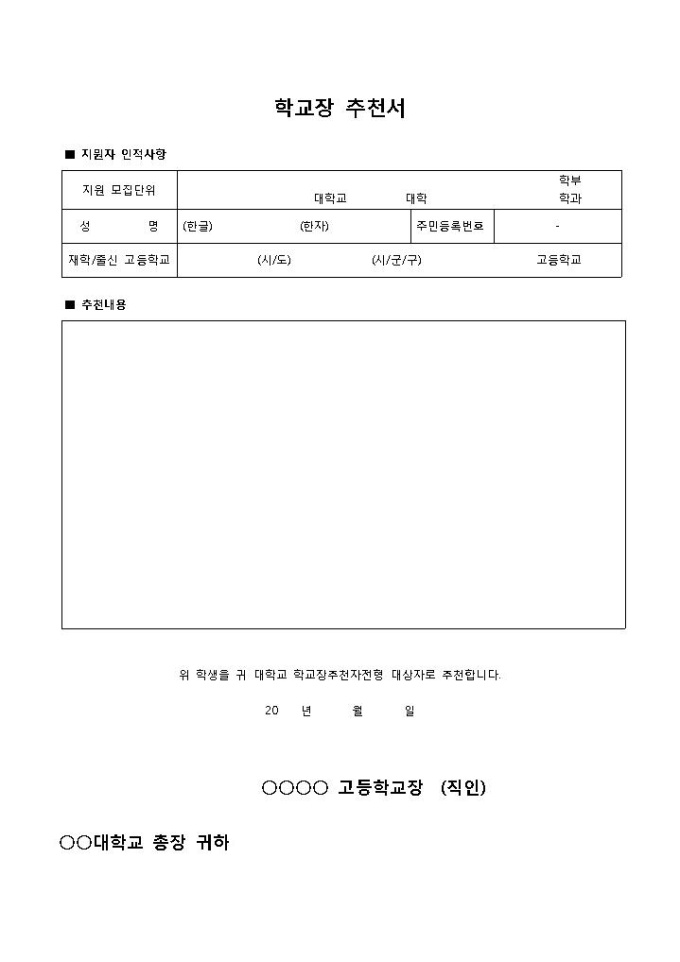 9,000원/월학교장추천서입니다. 지원자의 인적사항, 출신 고교, 추천내용 등의 항목으로 구성되어 있습니다. 대학 지원 시 사용할 수 있으며 추천내용을 구체적으로 기술할 수 있는 양식입니다.
