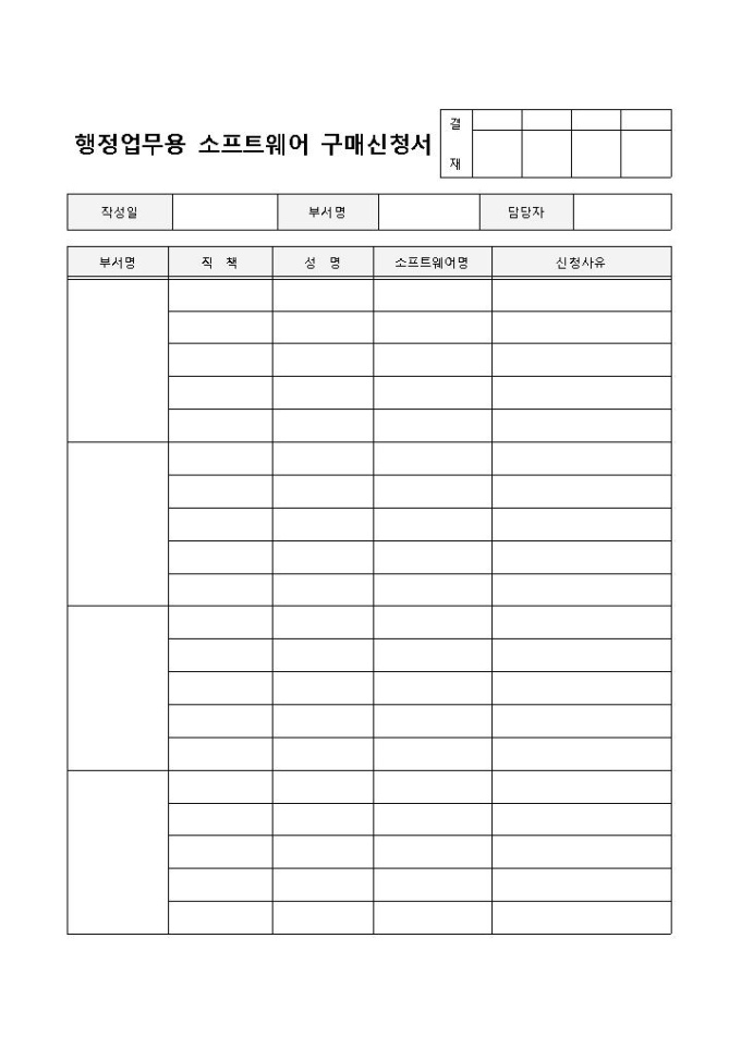 9,000원/월행정업무용소프트웨어 구매신청서 입니다. 작성일자, 부서명, 담당자, 부서명, 직책, 성명 등으로 구성되었습니다. 부서별 소프트웨어 신청 목록 및 사유 확인에 용이합니다.
