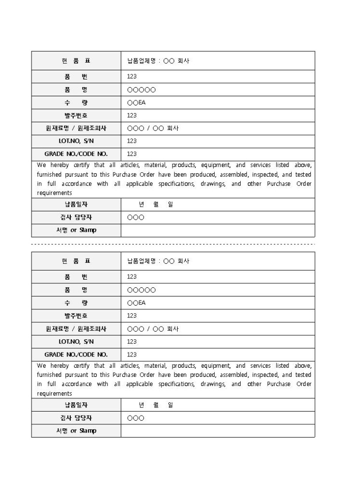 9,000원/월회사의 각종 물품이나 비품 등에 사용되는 현품표 양식입니다. 현품표, 품번, 품명, 수량, 발주번호, 납품일자 등의 항목으로 구성되어 있습니다.