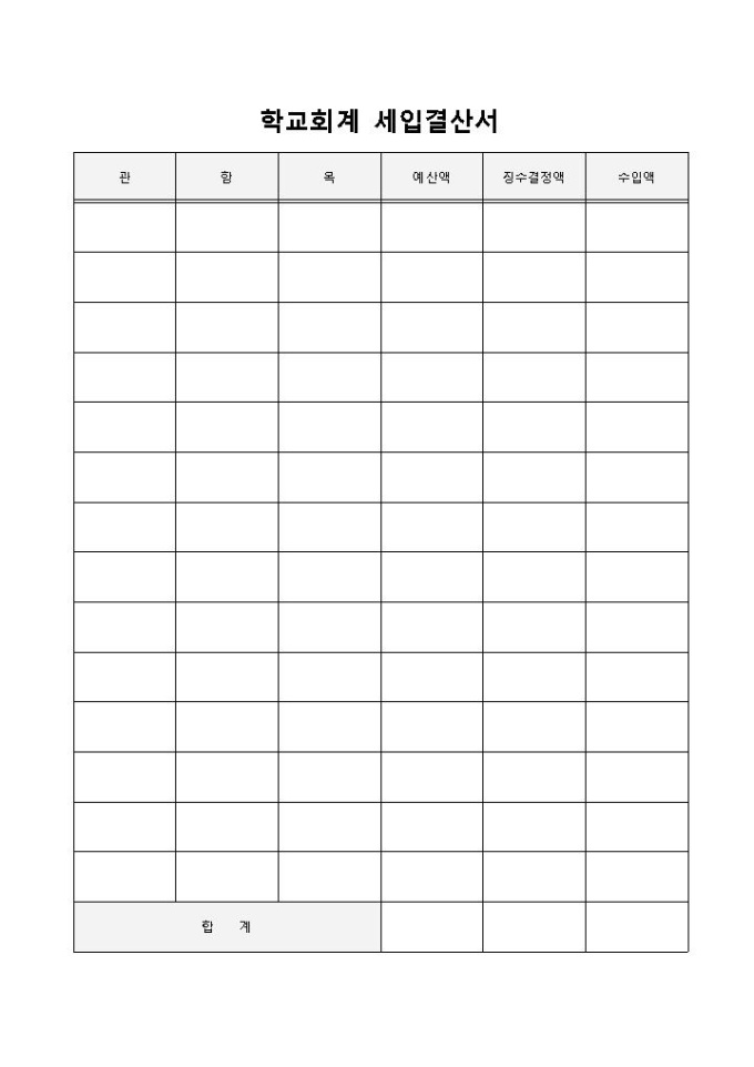 9,000원/월학교회계 세입결산서입니다. 관, 항, 목, 예산액, 징수결정액, 수입액으로 구성되어 있습니다. 학교에서 회계 상황을 기록하고 세입에 대한 결산을 할 때 작성하여 사용할 수 있습니다.