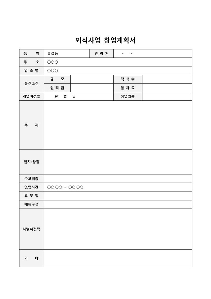 9,000원/월외식사업에 대한 창업 계획을 세울 때 사용되는 창업 사업계획서(외식사업) 양식입니다. 성명, 연락처, 주소, 업소명, 물건조건, 개업예정일, 창업업종, 임차료, 주제 등의 항목으로 구성되어 있습니다.