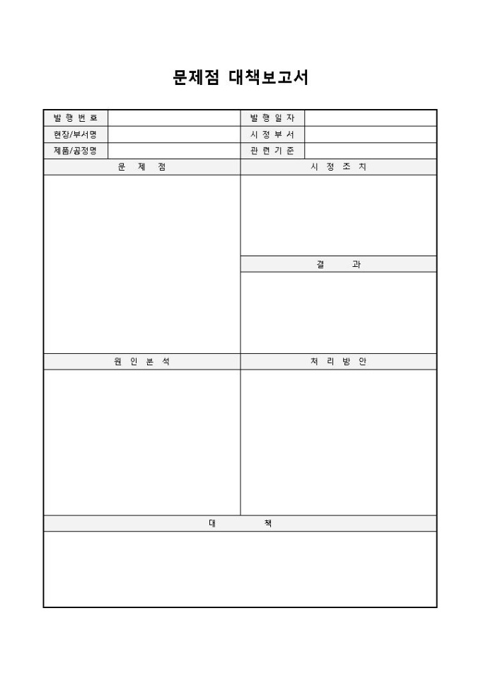 9,000원/월문제점 대책보고서입니다. 발행번호, 발행일자, 문제점, 시정조치, 원인분석 등으로 구성되어 있습니다. 문제점을 발견하고 이에 대해서 대책을 보고할 때 사용할 수 있습니다.