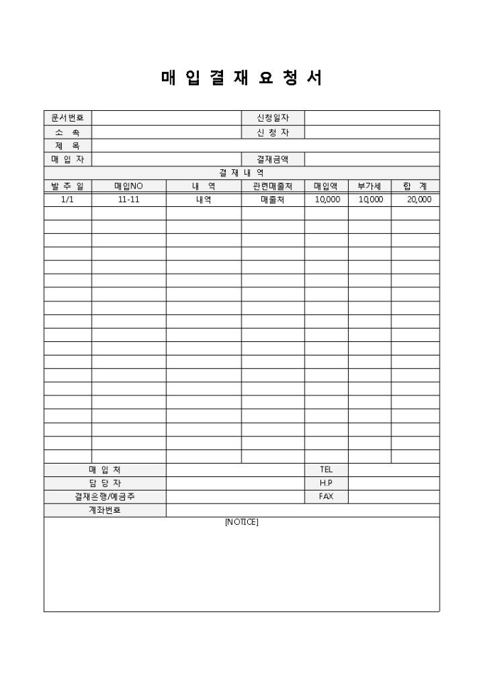 9,000원/월매입결재요청서입니다. 문서번호, 신청일자, 소속, 신청자, 제목, 매입자, 결제금액 등으로 구성되어 있습니다. 기업에서 매입에 대한 결재를 요청할 때 작성하여 사용할 수 있습니다.