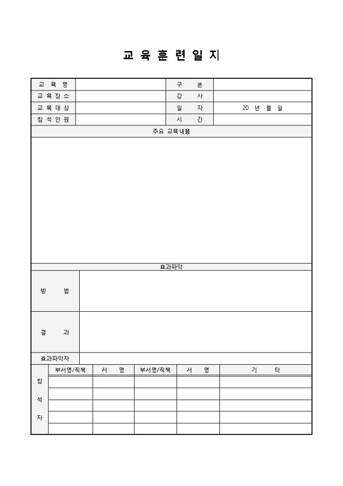 9,000원/월교육훈련일지입니다. 교육명, 구분, 교육장소, 강사, 교육대상, 일자, 참석인원, 시간, 주요 교육내용 등으로 구성되어 있습니다. 직원의 교육훈련을 일지로 사용할 때 작성하여 사용할 수 있습니다.