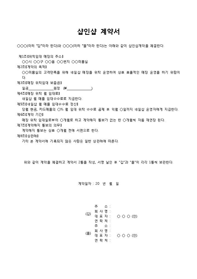 9,000원/월샵인샵 계약서입니다. 계약 내용으로 구성되어 있습니다. 위탁임대와 계약의 목적 등을 작성하여 샵인샵에 대한 계약서로 작성하여 사용할 수 있습니다.