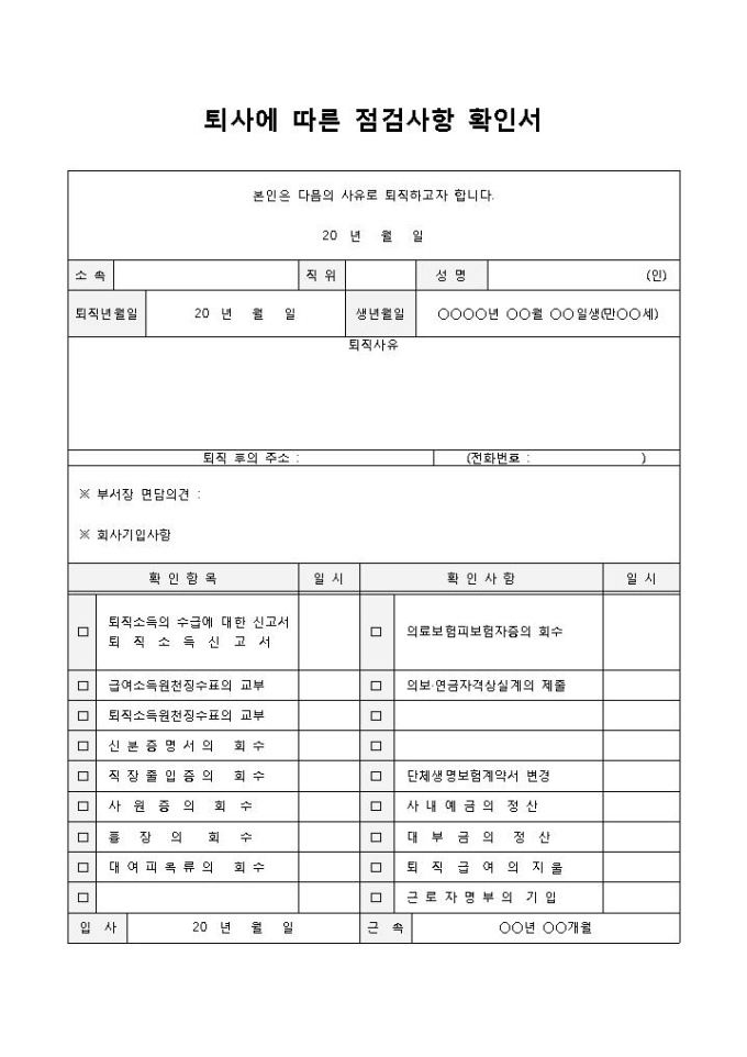 9,000원/월퇴사에 따른 점검사항 확인서입니다. 소속, 직위, 성명, 퇴직년월일, 생년월일 등으로 구성되어 있습니다. 회사에서 직원의 퇴사후에 점검해야 할 사항들이며 이에 대한 확인서로 작성하여 사용할 수 있습니다.