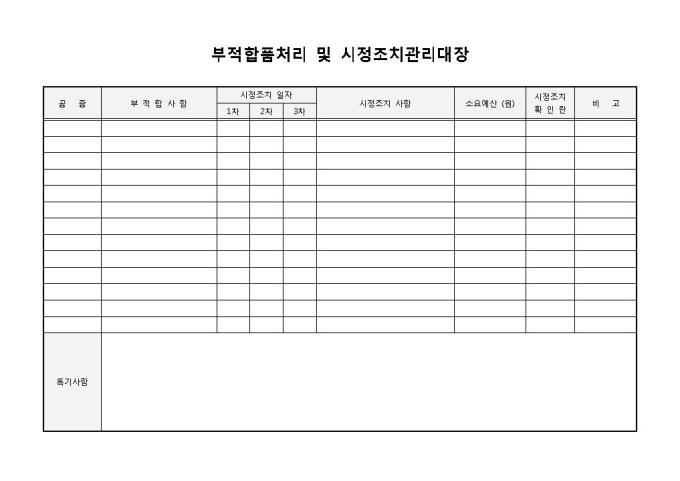 9,000원/월부적합품처리 및 시정조치관리대장입니다. 공종, 부적합사항, 시정조치 일자, 시정조치 사항, 소요예산 등으로 구성되어 있습니다. 회사에서 부적합과 이에 대한 시정조치를 관리할 때 작성하여 사용할 수 있습니다.