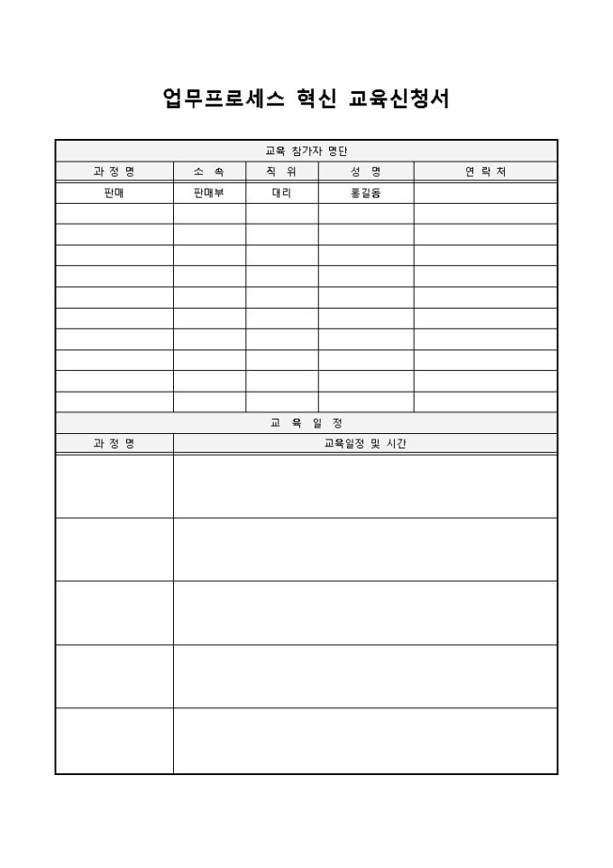 9,000원/월업무프로세서 혁신 교육신청서입니다. 교육 참가자 명단, 교일정 등으로 구성되어 있습니다. 부서에서 업무에 대한 혁신과 교육을 원하고 교육 일정에 대한 세부 항목도 작성할 수 있습니다.