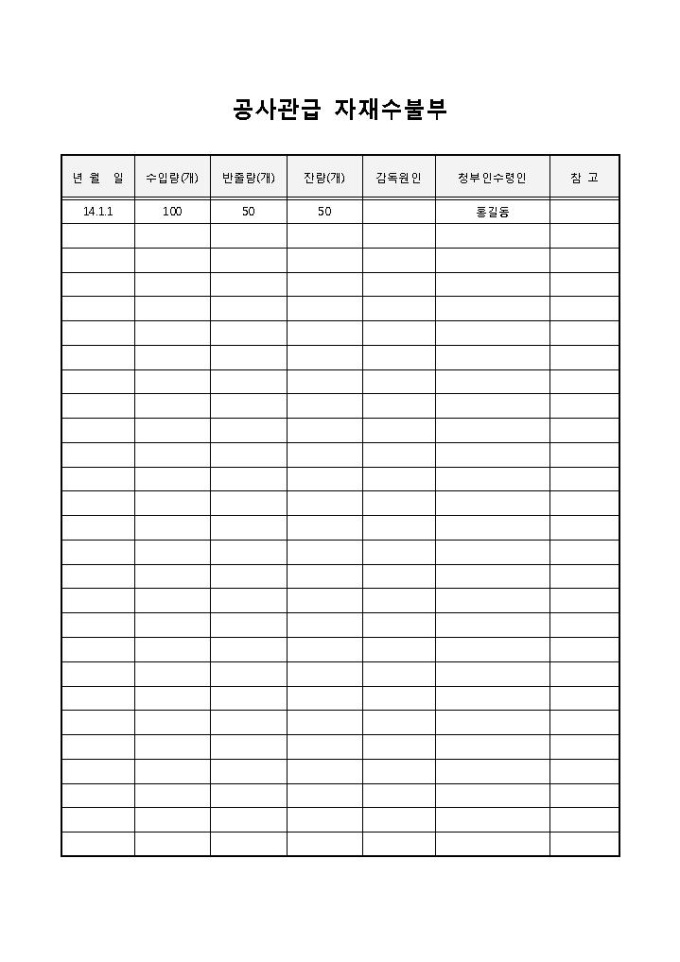 9,000원/월공사관급 자재수불부입니다. 날짜, 수입량, 반출량, 잔량, 감독원인, 청부인수령인 등으로 구성되어 있습니다. 공사관급에서 자재수불부를 작성할 때 사용할 수 있습니다.