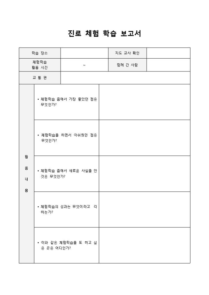 9,000원/월진로체험보고서입니다. 학습장소, 지도 교사 확인, 체험학습 활동 시간, 함께 간 사람 등으로 구성되어 있습니다. 진로 체험에 대한 학습 보고서를 작성할 때 사용할 수 있습니다.