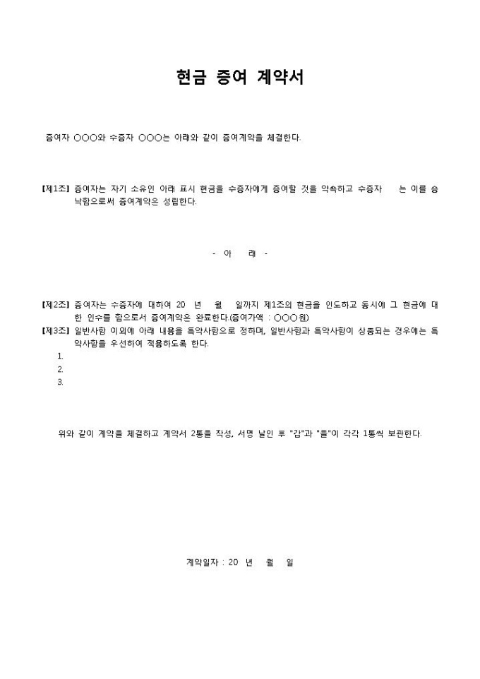 9,000원/월현금 증여 계약서입니다. 현금 증여 계약 내용으로 구성되어 있습니다. 현금에 대한 증여 계약을 작성 할 때 사용할 수 있습니다.