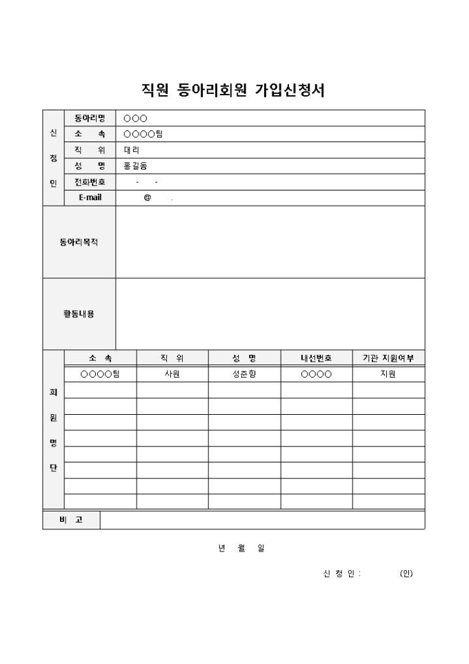 9,000원/월직장에서 직원들을 대상으로 운영하는 동아리의 회원 가입을 받을 때 사용되는 직원 동아리 회원가입신청서 양식입니다. 신청인의 소속, 직위, 성명, 전화번호, 이메일, 동아리명, 동아리목적, 활동내용, 회원명단 등의 항목으로 구성되어 있습니다.