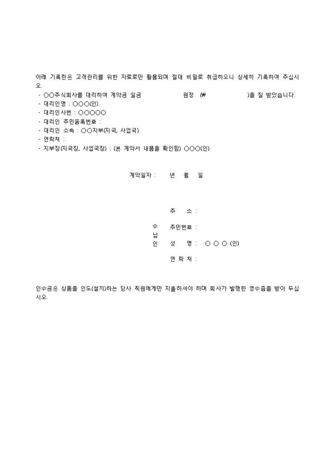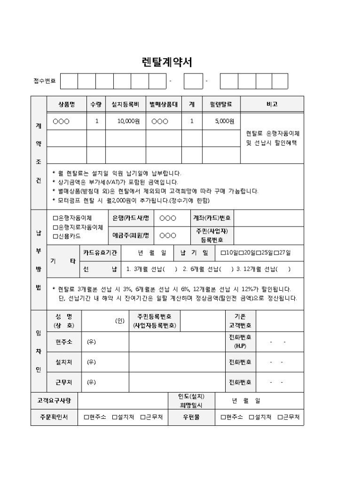 9,000원/월계약조건, 납부방법, 임차인, 수납인 확인란 등의 항목으로 구성되어 있는 렌탈 시 쓰이는 렌탈 계약서 양식입니다.