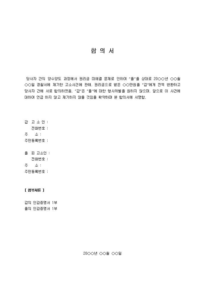 9,000원/월금전합의서입니다. 당사자 간의 금전 합의에 관하여 작성하는 합의서입니다. 갑과 을의 인적사항, 첨부서류 등으로 구성되어 있습니다.