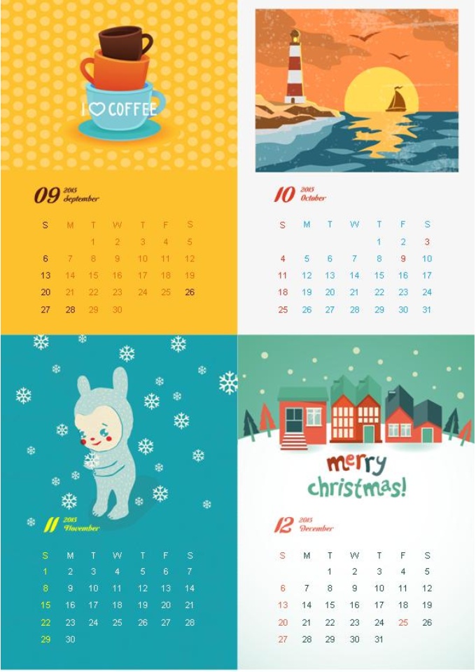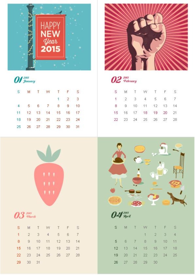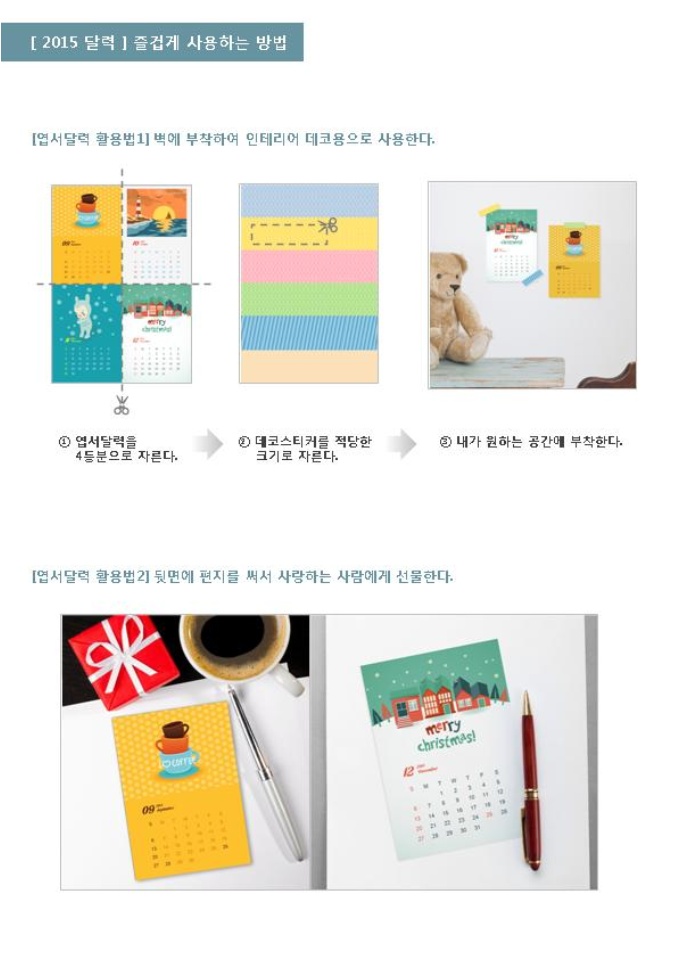 2015년 디자인달력(일러스트엽서형)입니다. 한 장에 네 가지의 일러스트엽서로 구성되어 있는 아담한 사이즈의 달력입니다. 벽에 부착하여 인테리어 효과를 높일 수 있으며 뒷면에 편지를 써서 사랑하는 사람에게 선물 하셔도 좋습니다. 다양한 일러스트와 활용도가 돋보이는 엽서형 달력으로 2015년 한 해의 멋진 계획을 만들어 보세요. 디자인달력 활용법 가이드가 첨부되어 있습니다.