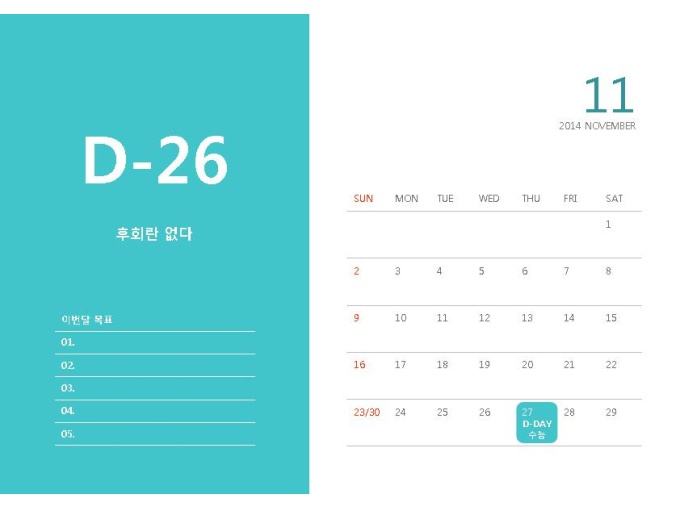 2015년 디자인달력(수능D-DAY)을 무료로 다운 받아 보세요. 목표일을 기점으로 D-DAY를 설정하고 이 달의 한마디, 목표를 기록할 수 있습니다. 얼마남지 않은 수능공부를 D-DAY달력과 함께 해보세요. 수능 외 공부, 여행, 다이어트 등 다양한 목표를 설정하여 활용할 수 있습니다. 디자인달력 활용법 가이드가 첨부되어 있습니다.