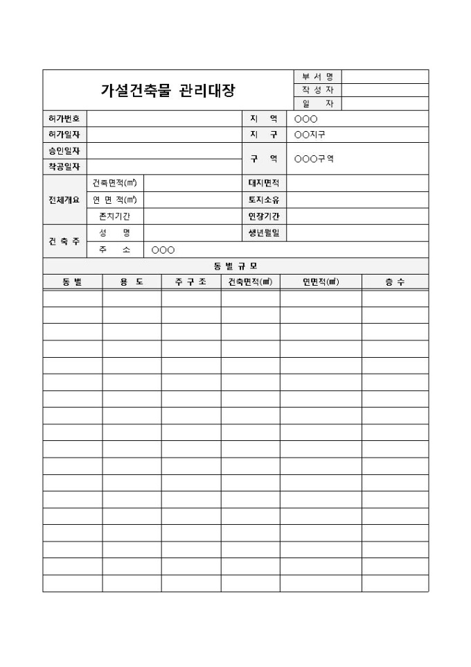 9,000원/월가설 건축물에 대한 허가 및 승인일자, 개요, 건축주, 동별규모의 기록 및 관리를 위해 사용되는 가설건축물 관리대장 양식입니다. 허가일자, 지역, 지구, 구역, 착공일자, 개요, 건축주, 규모 등의 항목으로 구성되어 있습니다.