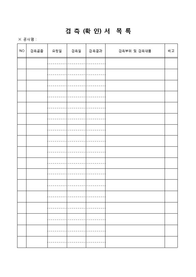 9,000원/월건축 공사를 시행하면서 공정별로 체크를 해봐야 할 사항을 정리할 때 사용되는 검측서 양식입니다. 순번, 검측공종, 요청일, 검측일, 결과 및 내용 등의 항목으로 구성되어 있습니다.