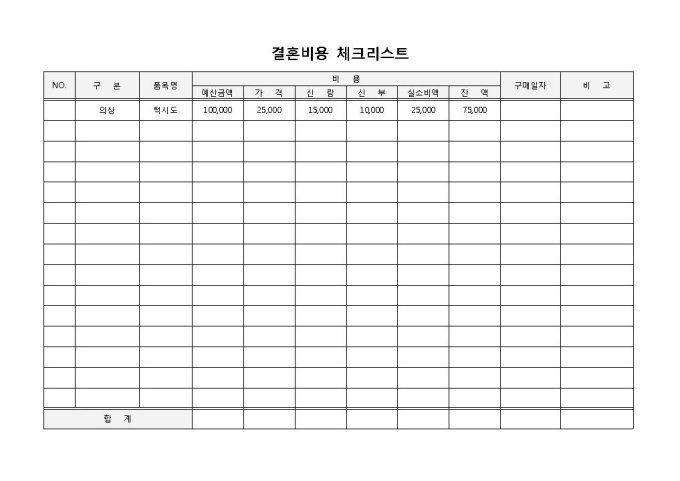 9,000원/월결혼비용체크리스트 입니다. 구분, 품목명, 비용, 구매일자 등으로 구성되었습니다, 비고란을 통해 취소실 물품을 결정하고 가격을 새로이 정리할 수 있습니다.