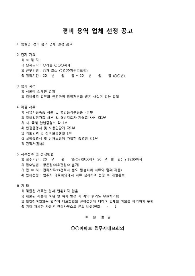 9,000원/월경비용역입찰공고(아파트)입니다. 입찰명, 단지개요, 참가자격, 제출서류, 서류접수및 선정방법 등의 항목으로 구성되어 있습니다. 아파트에서 경비 용역 입찰 내용을 알릴 때 기본적으로 사용할 수 있는 공고문양식입니다.