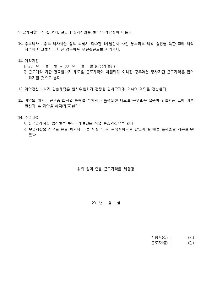 9,000원/월계약직 연봉계약서입니다. 사용자 인적사항, 근로자 인적사항 등으로 구성되어 있습니다. 계약직에 대한 근로 고용 계약서를 작성할 때 사용할 수 있습니다.