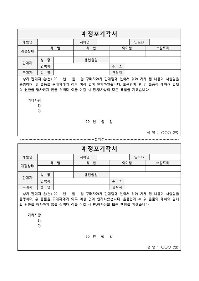 9,000원/월계정포기각서 입니다. 게임명, 양도ID, 계정상태, 레벨, 직업, 아이템, 스킬트리 등으로 구성되었으며, 지급 및 관리에 효율적인 양식입니다.