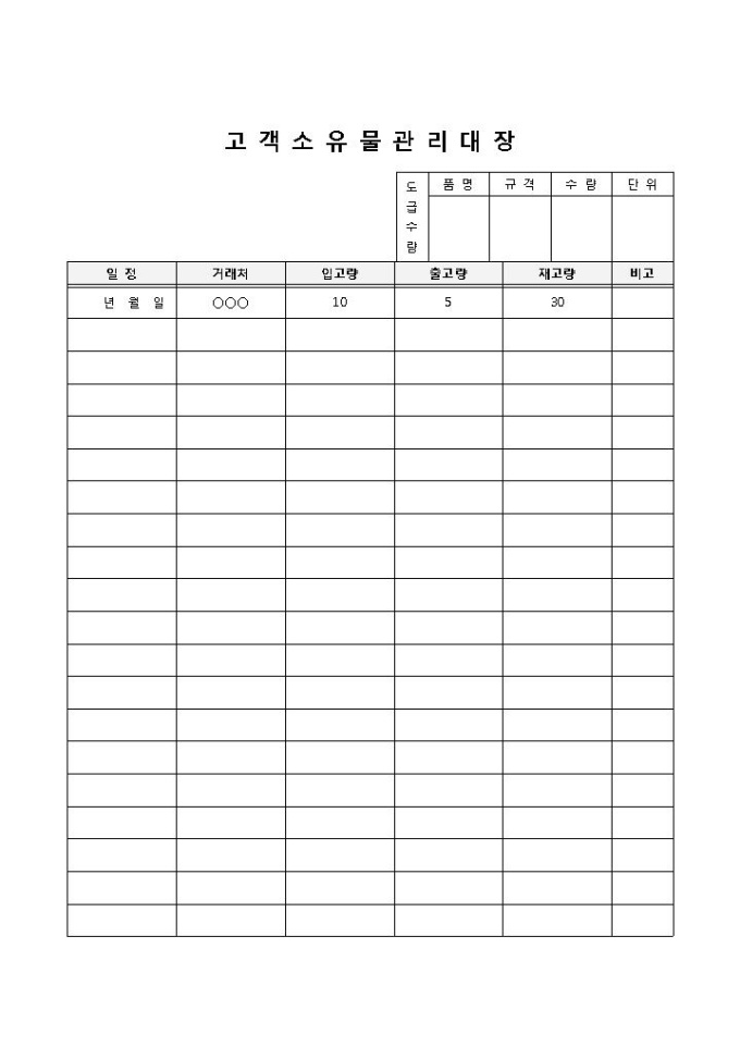 9,000원/월고객의 소유물에 대한 관리 및 기록을 위해 사용되는 고객 소유물 관리대장 양식입니다. 도급수량, 일정, 거래처, 입고량, 출고량, 재고량 등의 항목으로 구성되어 있습니다.