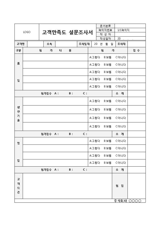 9,000원/월고객만족도에 대한 설문 조사를 실시하기 위한 문항으로 구성된 고객만족도 설문조사서 양식입니다. 품질, 생산기술 및 영업의 평가와 마지막으로 고객의견 항목이 있습니다.