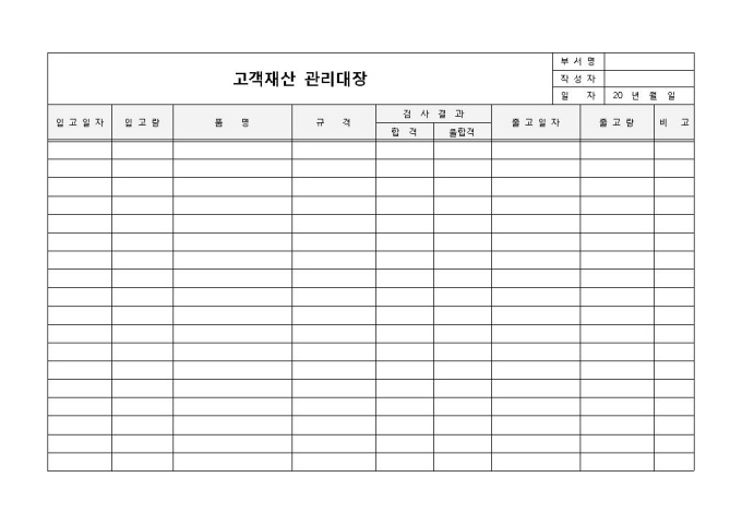 9,000원/월고객의 재산을 효율적으로 관리하기 위한 목적으로 사용되는 고객재산 관리대장 양식입니다. 입고일자, 입고량, 품목, 규격, 검사결과, 출고일자, 출고량 등의 항목으로 구성되어 있습니다.