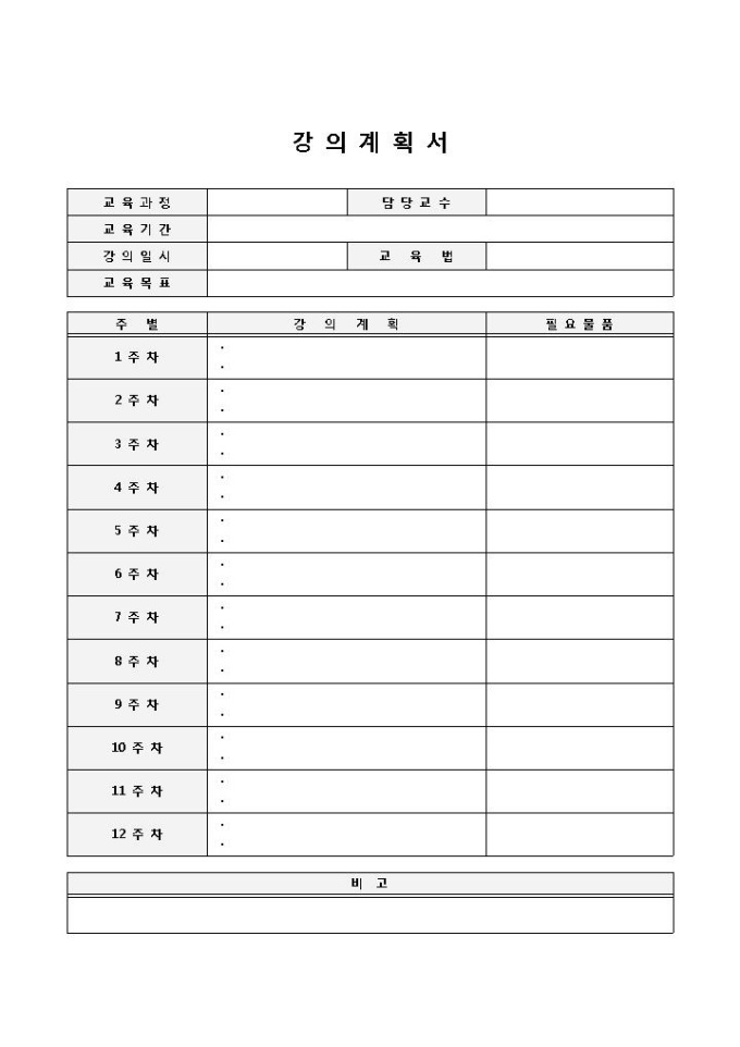 9,000원/월강사가 향후 수업하고자 하는 강의에 대한 계획을 세울 때 사용되는 고등학교 강의 계획서입니다. 교육과정, 기간부터 시작해서 주차별로 상세하게 기록이 가능하게 끔 되어 있습니다. 고등학교용 강의 계획을 위해 쓰입니다.