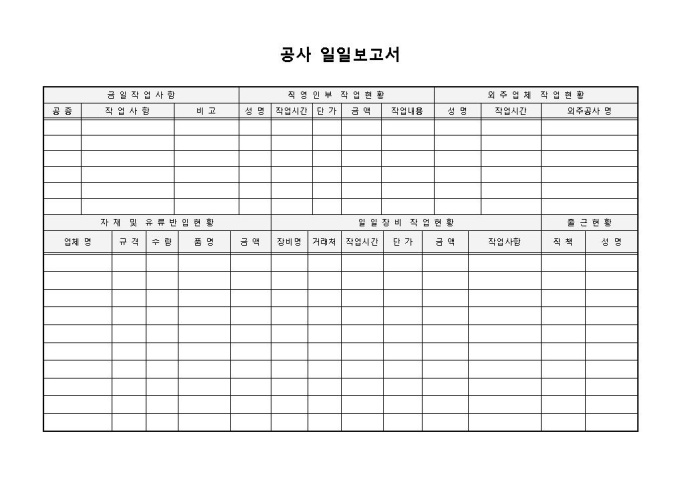 9,000원/월공사 일일보고서입니다. 금일작업사항, 직여인부 작업현황, 외주업체 작업 현황 등으로 구성되어 있습니다. 공사현장에서 공사관리자가 일일에 대한 보고서로 작성하여 사용할 수 있습니다.
