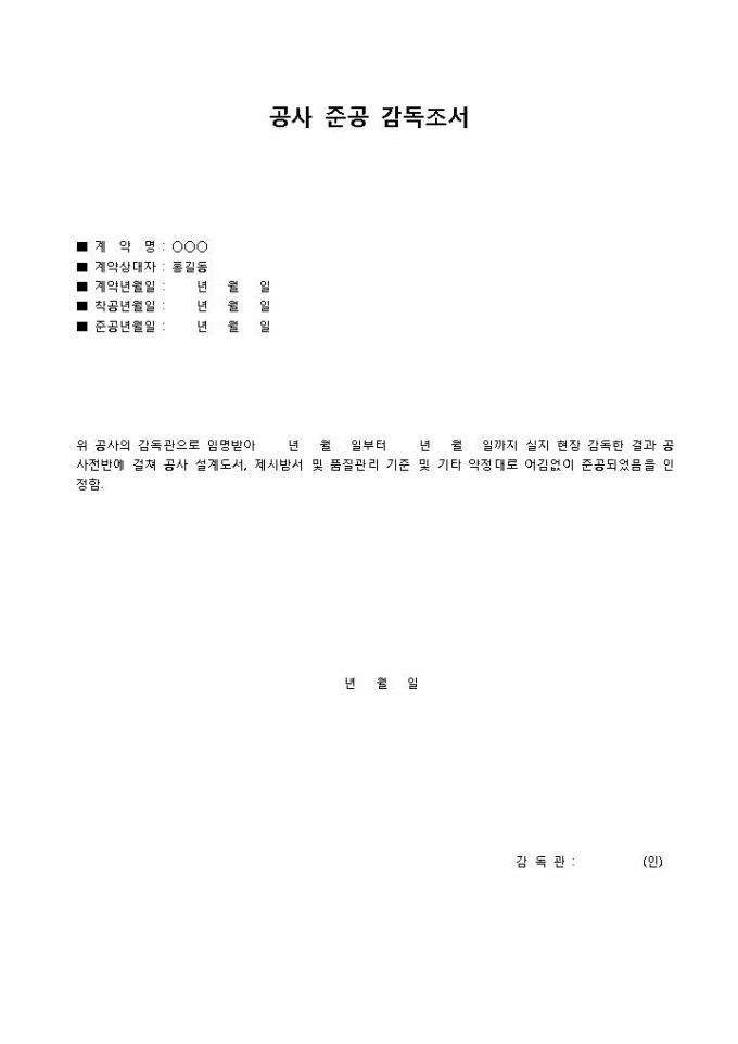 9,000원/월준공된 건축물에 대한 검사 결과를 감독하고 기록할 때 사용되는 공사 준공 감독조서 양식입니다. 계약명, 계약상대자, 계약년월일, 착공년월일, 준공년월일 등의 항목으로 구성되어 있습니다.