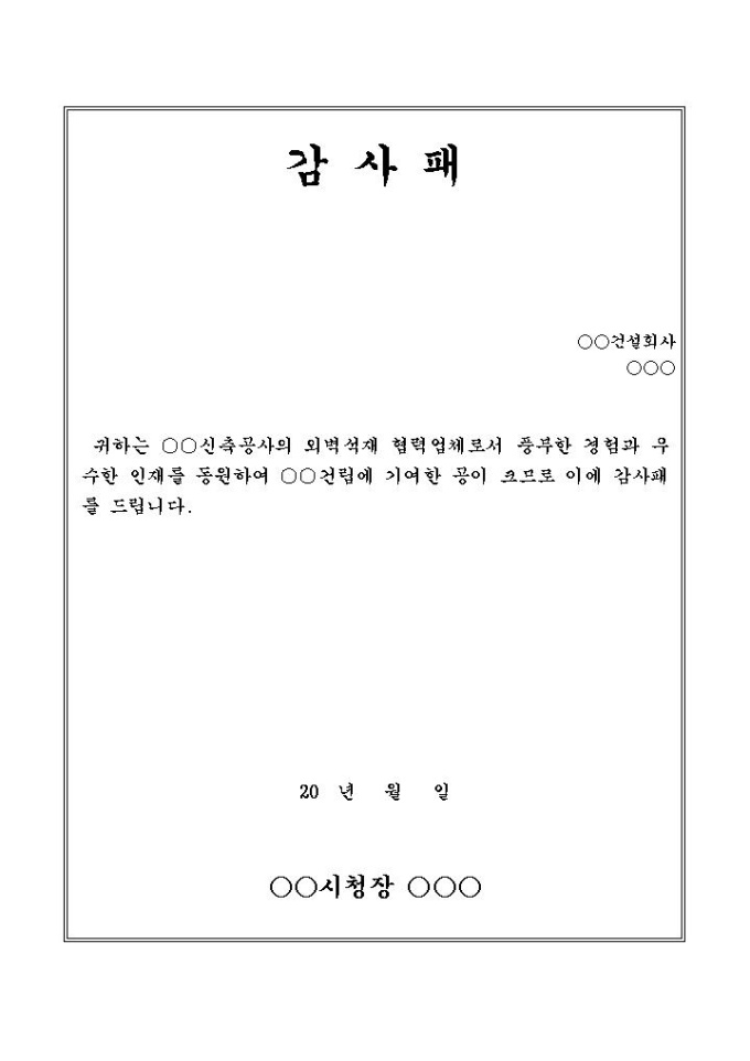 9,000원/월공사감사패입니다. 시청장이 건설회사에 신축공사에 대한 감사를 전할 때 사용할 수 있는 감사패 양식입니다.