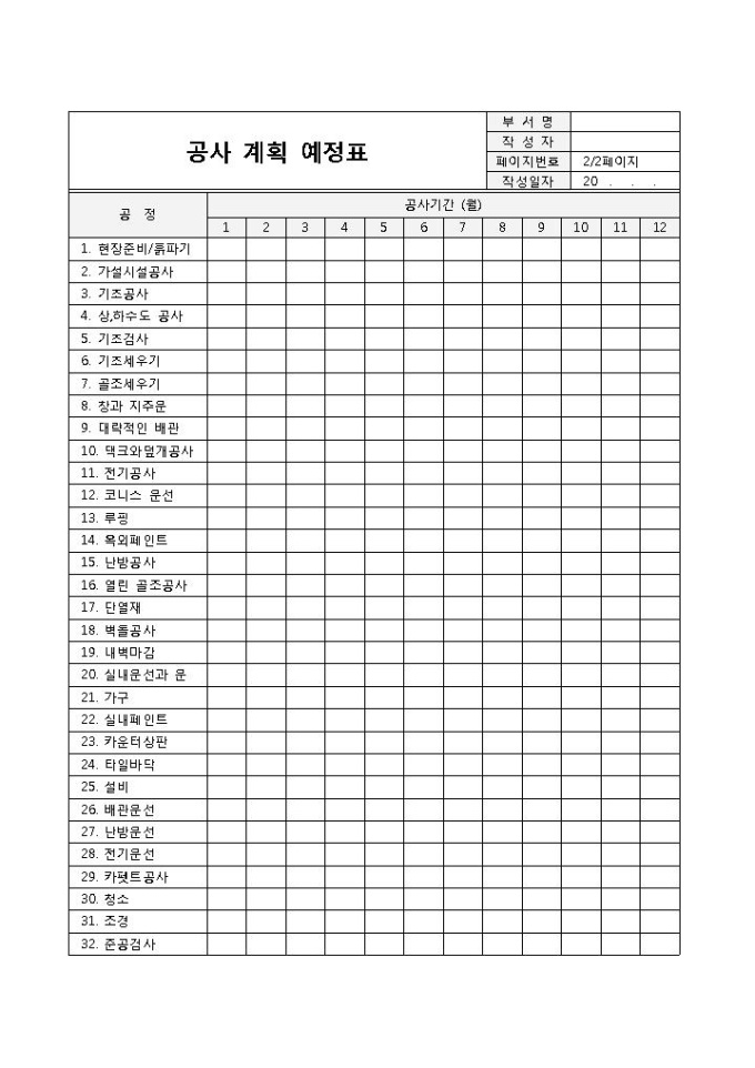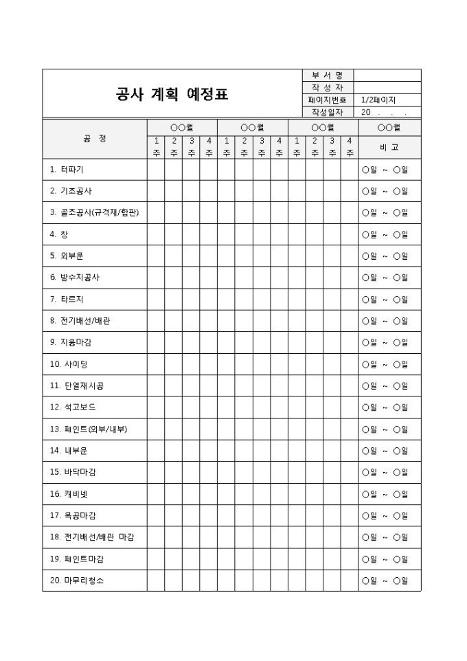 9,000원/월앞으로 계획하고 있거나 시행 중인 공사에 대한 계획과 진행 사항을 정리할 때 사용되는 공사 계획서 양식입니다. 여러 공정단계와 날짜 등의 항목으로 구성되어 있습니다.