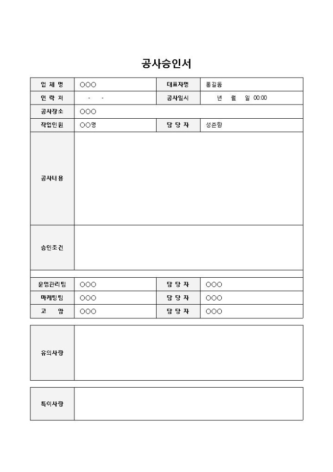 9,000원/월공사 시 승인 요청을 의뢰하거나 마케팅팀에서 기록 보관을 위해 사용되는 공사승인서(마케팅팀 보관용) 양식입니다. 업체명, 대표자명, 연락처, 공사일시, 공사장소, 작업인원, 담당자, 공사내용, 승인조건, 운영관리팀, 마케팅팀 등의 항목으로 구성되어 있습니다.