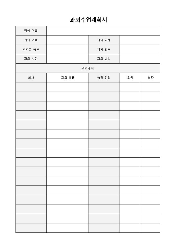 9,000원/월과외수업계획서 입니다. 회차, 과외내용, 목표 등으로 구성되어있기 때문에 학생지도에 보다 용이한 양식입니다.