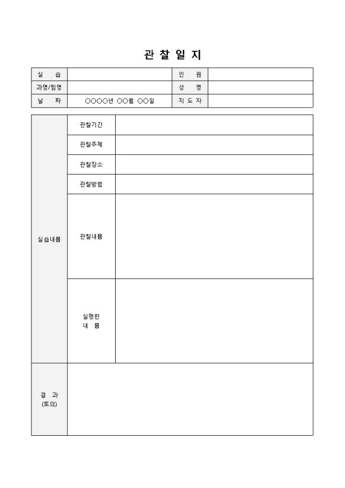 9,000원/월관찰일지 입니다. 실습, 인원, 성명, 과명, 날짜, 관찰기간, 관찰주제, 내용 등으로 구성되었습니다. 실습내용 및 관찰사항 등을 간편하게 작성할 수 있으며, 토의를 통해 결론도출에 용이합니다.