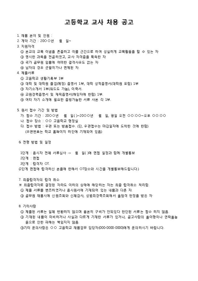 9,000원/월고등학교 교사채용공고 양식입니다. 채용분야, 지원자격, 제출서류, 원서접수 기간 등으로 구성되었습니다. 예시문이 작성되있으며, 내용의 추가 및 수정이 용이합니다.
