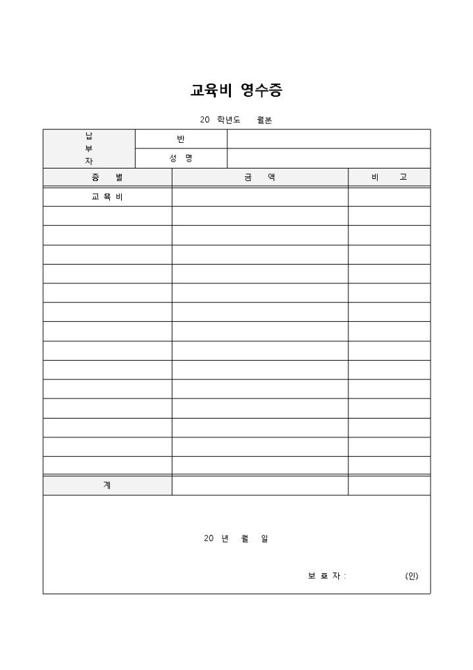 9,000원/월교육비를 납부했음을 인증할 때 사용되는 교육비 영수증 양식입니다. 납부일자 및 납부자, 종별, 금액, 합계 등의 항목으로 구성되어 있습니다.