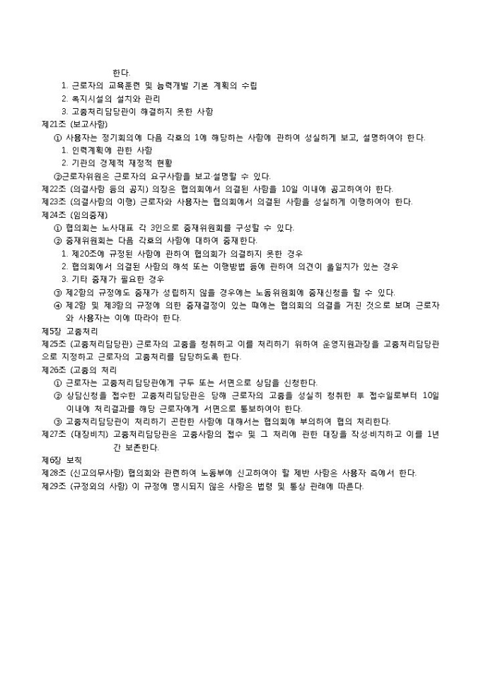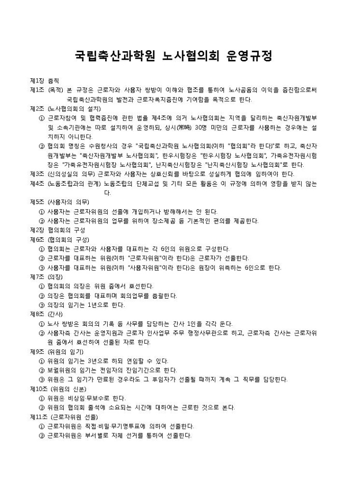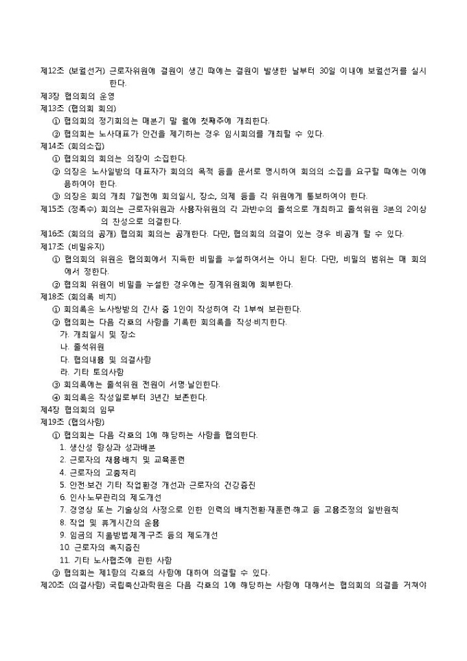 9,000원/월국립축산과학원 노사협의회 운영규정입니다. 노사협의회의 운영 규정으로 구성되어 있습니다. 근로자와 사용자의 이해와 협조, 노사공동의 이익을 목적으로 발전과 근로자 복지증진에 기여하기 위함을 목적으로 운영규정을 작성할 때 사용할 수 있습니다.
