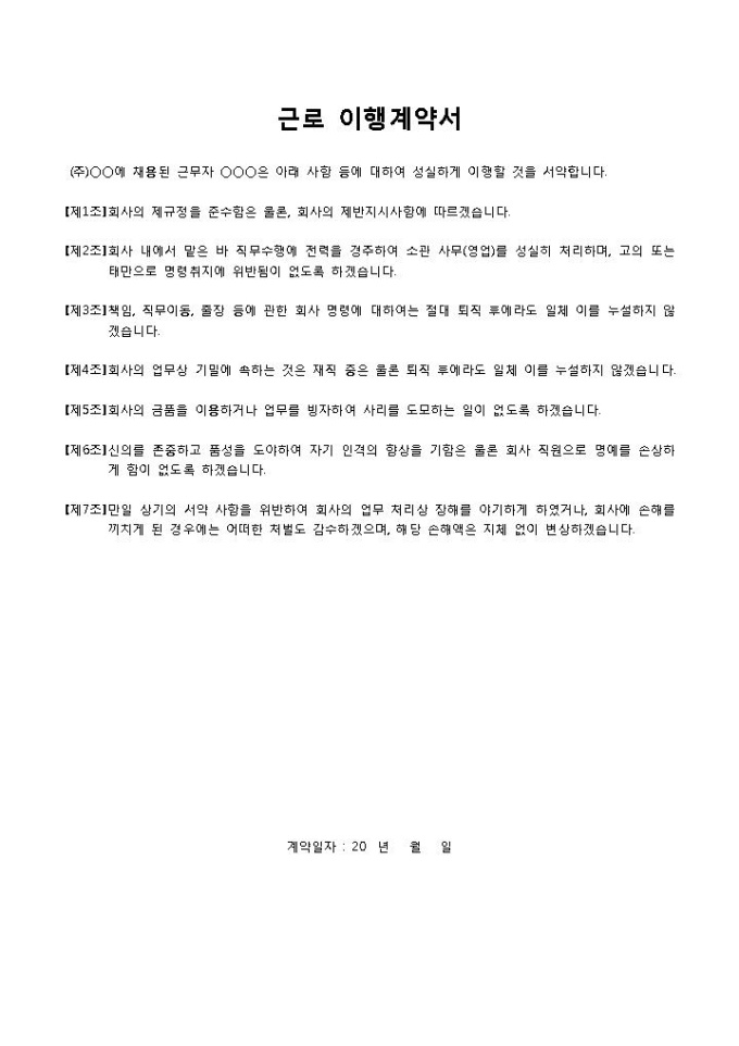 9,000원/월근로 이행계약서입니다. 계약 내용, 소속, 직위, 성명, 연락처 등으로 구성되어 있습니다. 주식회사에서 채용된 근로자는 아래 사항 등에 대하여 성실하게 이행할 것을 계약할 때 작성하여 사용할 수 있습니다.