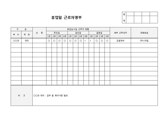 9,000원/월휴업일 근로자명부 입니다. 부서, 직위, 성명, 휴업실시일 근무자 현황으로 구성되었으며, 출근일 파악 및 특이사항 기록에 용이한 양식입니다.