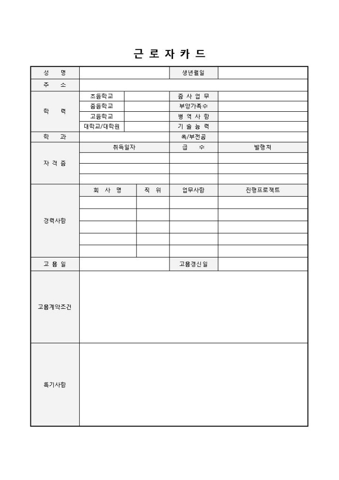 9,000원/월경력사항중점 근로자카드입니다. 성명, 생년월일, 주소, 학력, 학과, 자격증, 경력사항, 고용일, 고용갱신일, 고용계약조건 등의 항목으로 구성되어 있습니다. 회사 내 근로자카드, 인사기록카드 작성 시 활용할 수 있습니다.