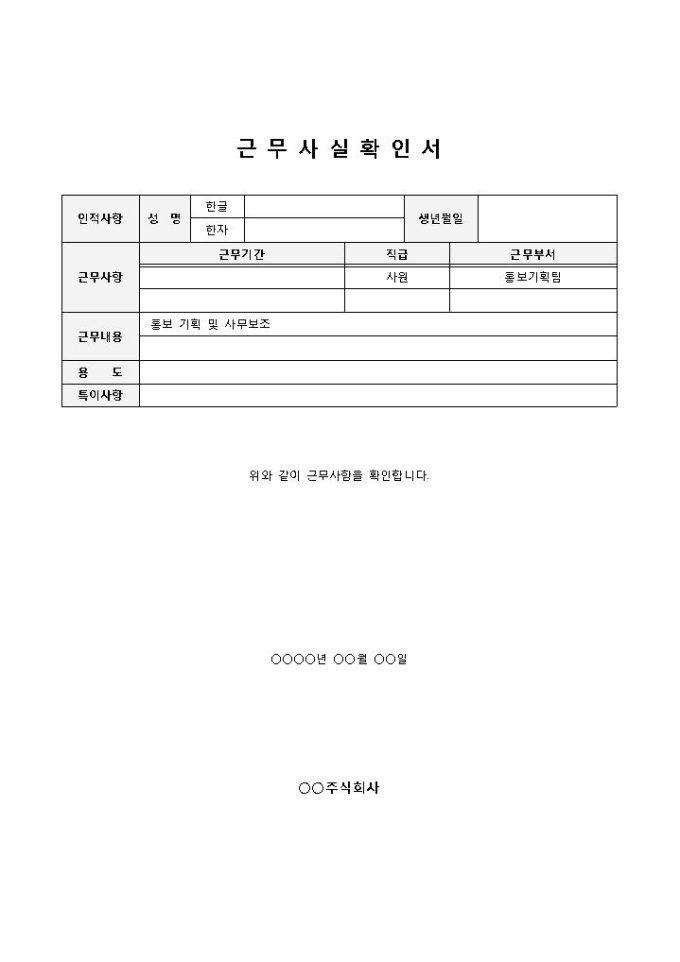 9,000원/월근무사항의 사실 확인을 위해 사용되는 근무 사실확인서 양식입니다. 근무자의 인적사항, 근무사항, 근무내용, 용도, 특이사항 등의 항목으로 구성되어 있습니다.