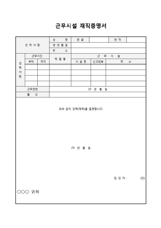 9,000원/월근무시설 재직증명서입니다. 근무자 인적사항, 경력사항, 근무기간, 직종별, 근무시설, 근무연한, 용도 등으로 구성되어 있습니다. 근무자가 위와 같은 근무시설에서 경력을 증명할 때 작성하여 사용할 수 있습니다.